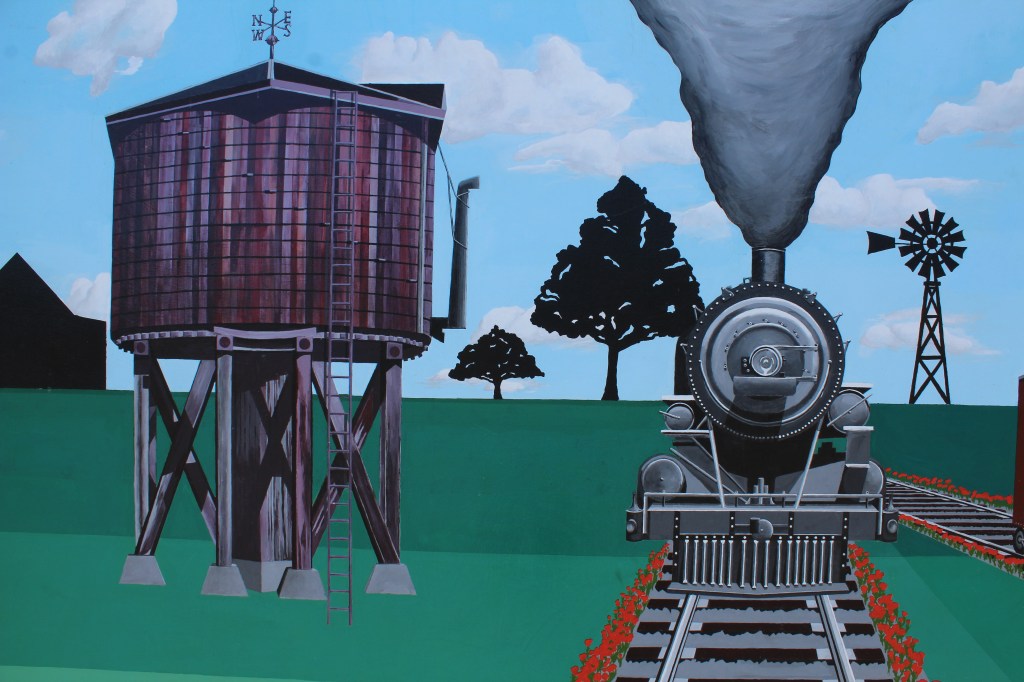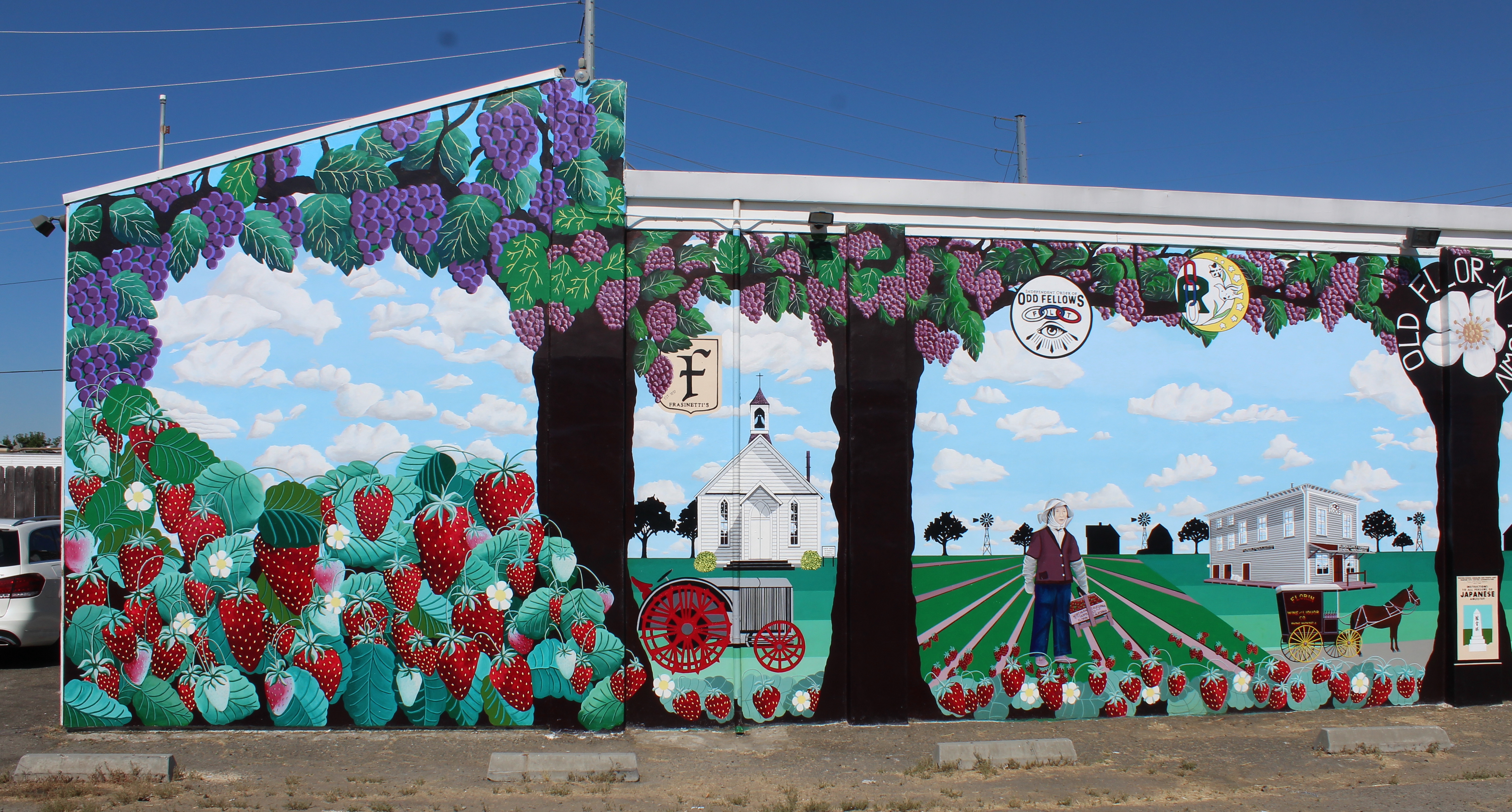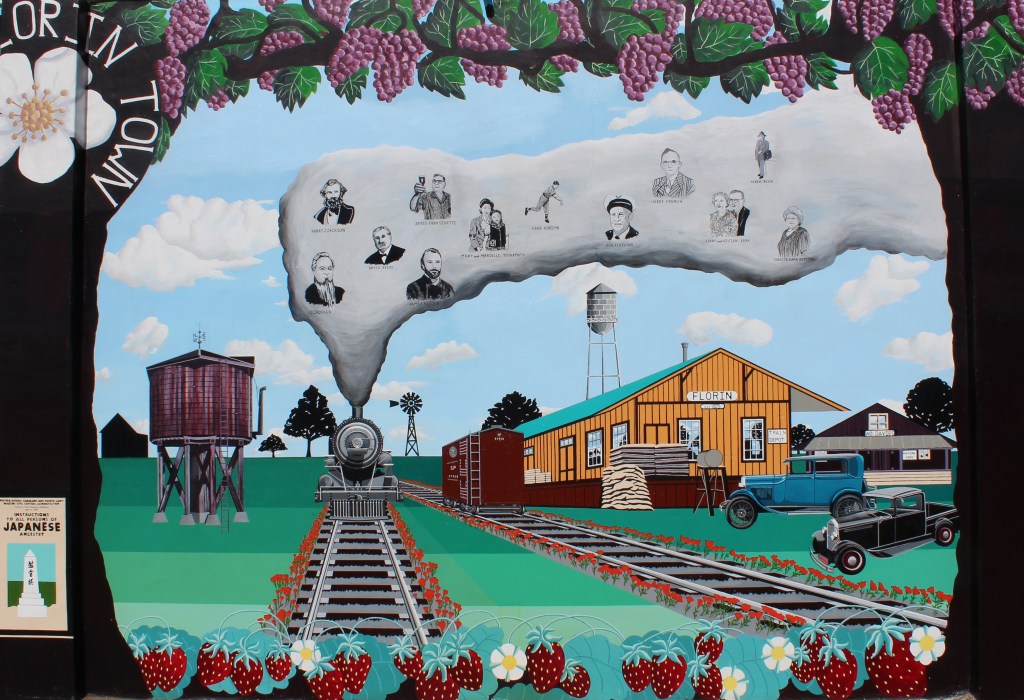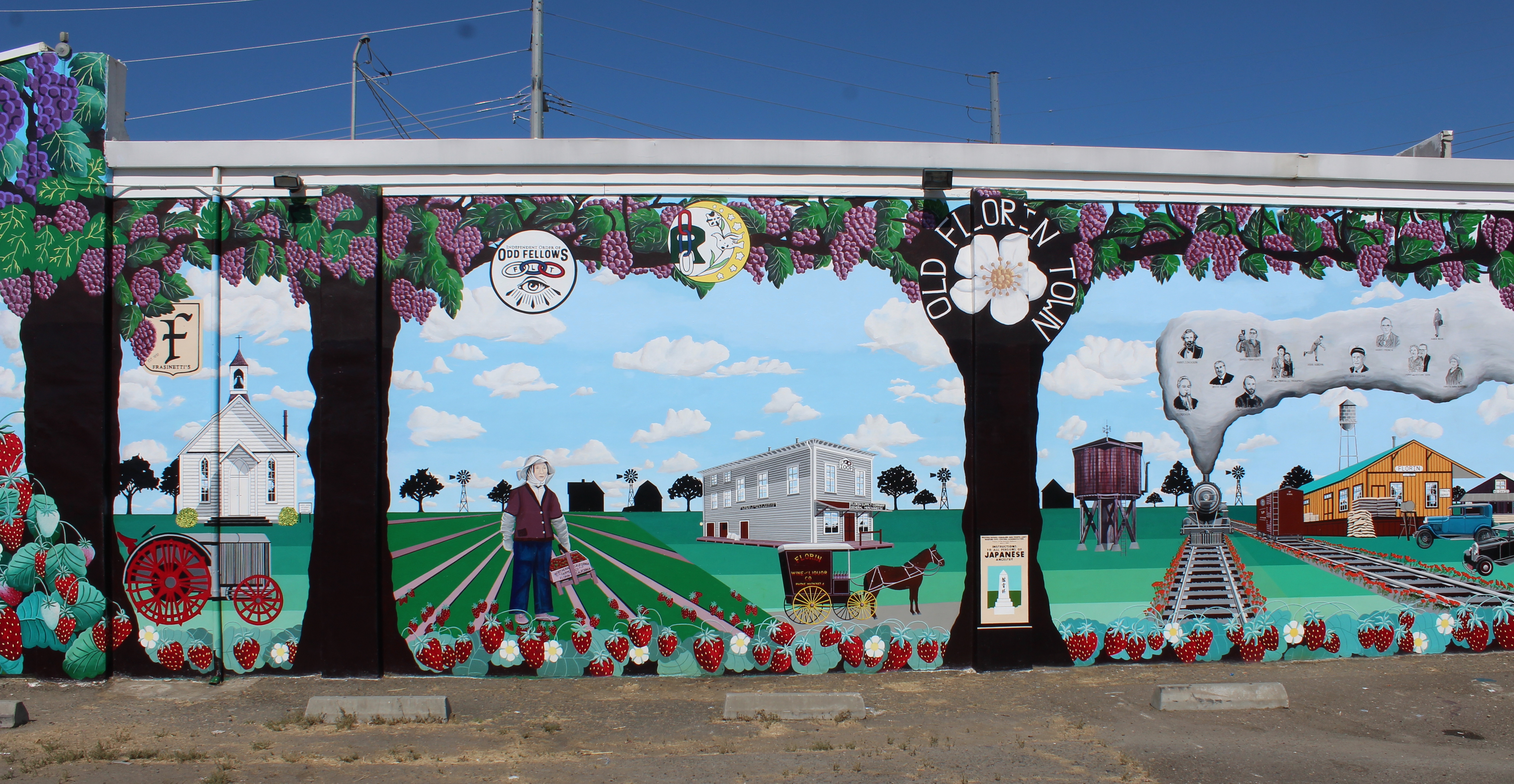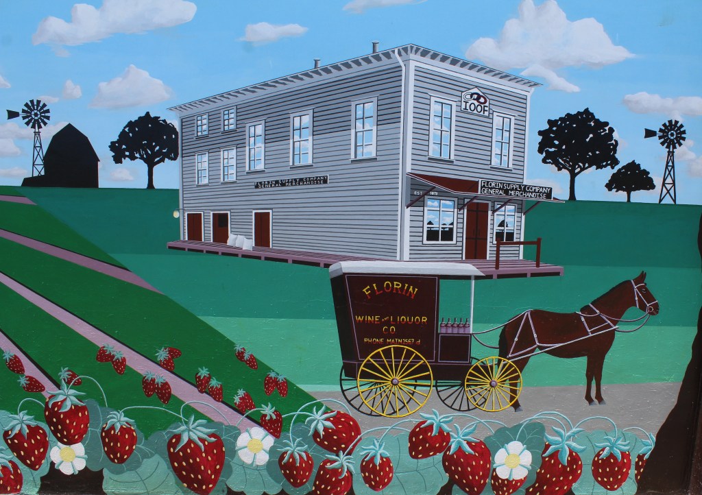 Old Florin Town Community Mural documents 150 year history of the Florin area. The imagery reference vintage photographs and community stories. The mural was designed and funded in collaboration with the Florin Historical Society and Supervisor Patrick Kennedy’s office for County District 2.